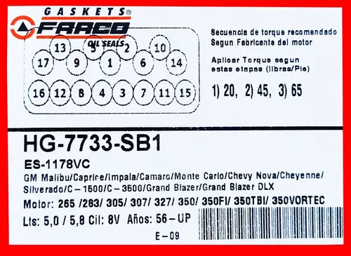 Empacadura Cámara CHEVROLET 305/ 350/ 265/ 283/ MALIBU/ CAPRICE/ MONTE CARLO/ PICK – UP/ CHEYENNE SILVERADO BLAZER/ GRAND BLAZER MOTORES V8 5.0/ 5.7/ 5.8/